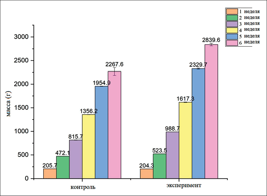 Экспериментальные животные содержались и кормились в соответствии с зоотехническими нормами. Суточный прирост измерялся электронными весами SF-400 с точностью ±5,0 г, а гематологические показатели – с помощью автоматического гематологического анализатора Mindray BC-5000 [7]. Образцы крови отбирались в вакуумные пробирки, содержащие 1 мл раствора ЭДТА (этилендиаминтетрауксусной кислоты). Полученные данные были обработаны, рассчитаны средние значения. Статистическая обработка результатов проводилась в программе Microsoft Excel 2013 (США), при этом использовались методы математической и статистической оценки: средние значения, отклонения и вероятностный анализ по методу Лакина [8, с. 37].