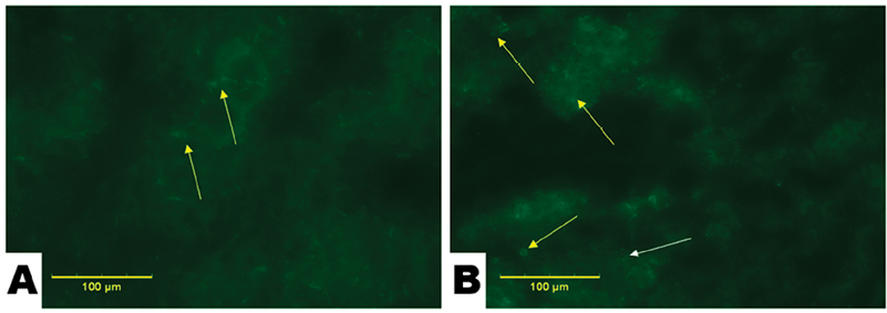 Рис. 1. Микрофотографии почек крыс, окрашенных флуоресцирующей краской после введения микропластика: А – контроль (после введения дистиллированной воды), В – опыт (после введения флуоресцентных микрочастиц). Желтые стрелки указывают на аутофлуоресценцию тканей, белые – на частицы микропластика