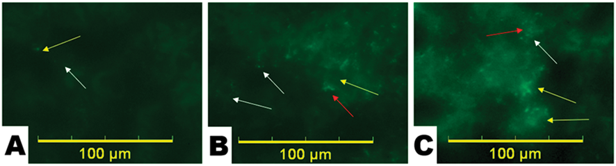 Рис. 2. Микрофотографии разных полей зрения почек крыс опытной группы, окрашенных флуоресцирующей краской после введения микропластика – мозговой (А) и корковый (С, В) слои. Желтые стрелки указывают на аутофлуоресценцию тканей, белые – на частицы микропластика, красные – на их конгломераты