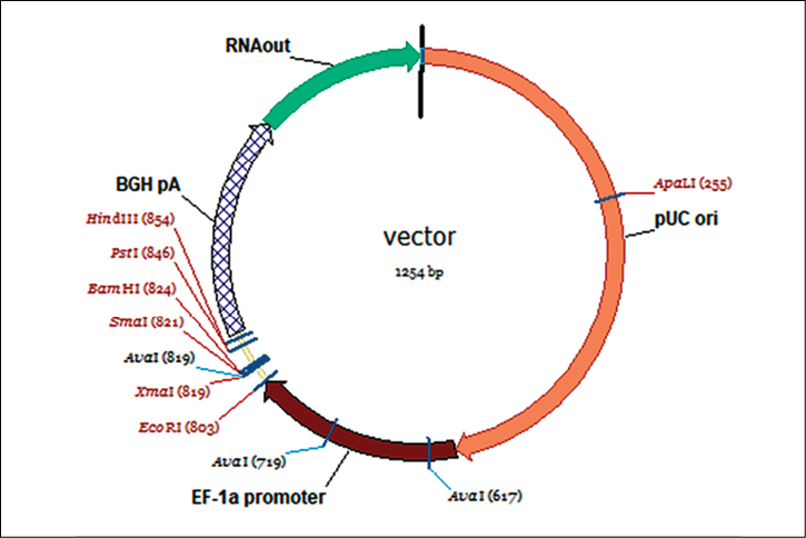 3) RNA-out – регуляторный элемент РНК-out транспозона Т10, обеспечивающий возможность положительной селекции без использования антибиотиков при использовании модифицированного штамма E. coli DH5α;