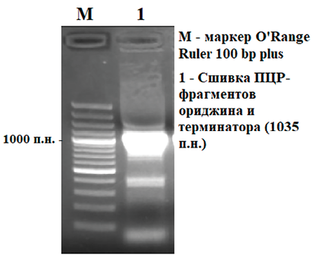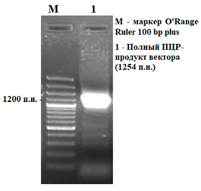Элементы вектора амплифицированы и сшиты между собой с помощью ПЦР. Полимеразную цепную реакцию проводили в реакционной смеси объемом 30 мкл, содержащей 0,7 мкл (1 ед.) Tersus ДНК-полимеразы (Евроген, Россия), 3 мкл буфера для Tersus ДНК-полимеразы (20 мМ Tris-HCl (pH 8,8), 10 мМ (NH4)2SO4, 10 мМ KCl, 2 мМ MgCl₂, 0,1% Tween-20, 1 М бетаин, 0,1 мг/мл BSA), 1,5 мкл (2,5 мМ) смеси дезоксинуклеозидтрифосфатов (dNTP), по 0,3 мкл 100 мкМ олигонуклеотидов F1 и R1. Объем реакции доводили до 30 мкл деионизированной водой. Амплификацию проводили при следующем режиме: 1 цикл: денатурация +95 °С – 3 мин; 24 цикла: денатурация +95 °С – 20 с, отжиг праймеров (Тотж = 64°C) – 50 с, полимеризация при +72°С – 1 мин.