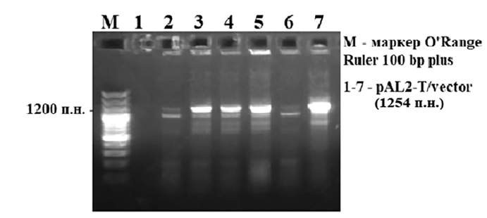 ПЦР-продукт размером 1254 п.н. далее был залигирован в клонирующий вектор pAL2-T (Евроген, Россия) с последующей трансформацией в клетки E. coli. Клеточная суспензия после трансформации втиралась в чашку с агаризованной средой LB, ампициллином (100 мкг/мл), S-Gal и индуктором IPTG. Чашки Петри инкубировали в термостате при 37 °С в течение 16 ч. Далее, для отбора клонов, несущих вставку нужного размера, проводили скрининг с праймерами T7 и Sp6 (рис. 4).