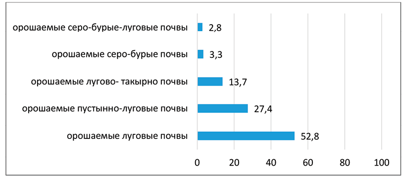 В 2020 г. общие земли орошаемого земледелия Гиждуванского района составили 19 994 тыс. га, из них 52,8 % луговые почвы, 27,4 % пустынно-луговые, 13,7 % лугово-такырные, 3,3 % серо-бурые, 2,8 % серо-бурые-луговые почвы (рис. 1).