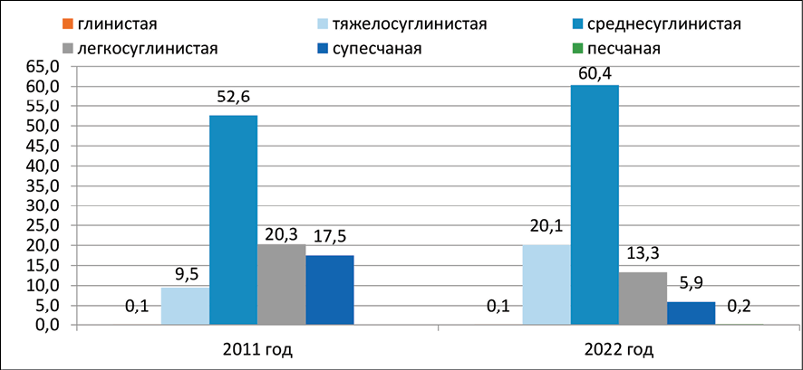 За 11 лет почвы с тяжелым суглинистым механическим составом увеличились на 10,6 %, а почвы со средним суглинистым составом – на 7,8 %. Установлено, что механический состав легких суглинистых почв уменьшился на 7,0 %, а супесчаных – на 11,6 %. В течение 2011–2022 гг., то есть 11 лет, механический состав почв ухудшался под влиянием орошения сельскохозяйственных культур (антропогенных факторов).