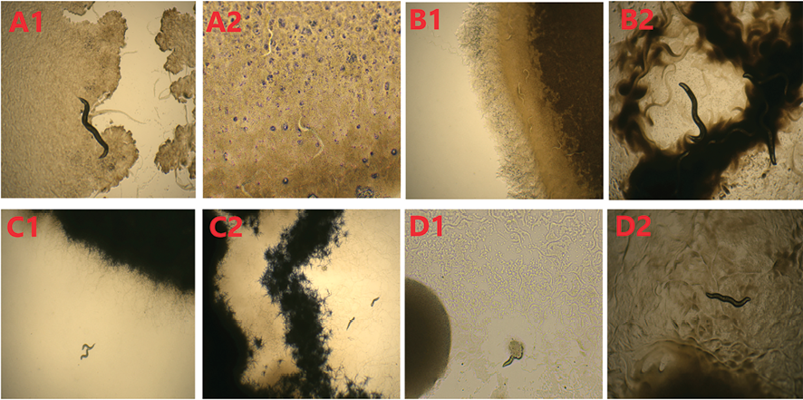 Рис. 2. Развитие нематод на 1-е и 7-е сутки при инкубации с бактериальными культурами на чашке Петри: А1 – 1-й день после инкубации яиц нематод со штаммом MGMM30, А2 – 7-й день после инкубации со штаммом MGMM30, В1 – 1-й день после инкубации со штаммом MGMM36, В2 – 7-й день после инкубации со штаммом MGMM36, С1 – 1-й день после инкубации со штаммом MGMM37, С2 – 7-й день после инкубации со штаммом MGMM37, D1 – 1-й день после инкубации со штаммом MGMM57, D2 – 7-й день после инкубации со штаммом MGMM57 Примечание: на рисунке приведены оригинальные фотографии, сделанные авторами в ходе исследования
