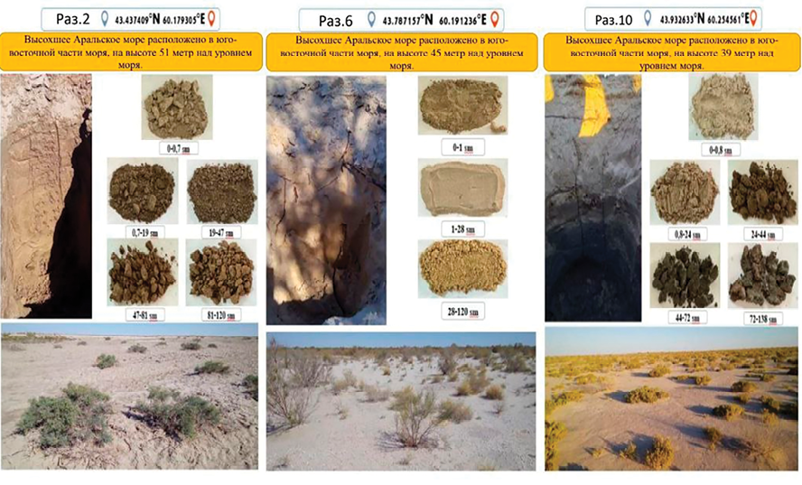 Каждый из разрезов почвы был взят на различных высотах над уровнем моря, что также влияет на растительность и животный мир, которые здесь обитают. В Восточной части высохшего Арала наблюдается различие в растительности в зависимости от расстояния от Арала. На входе в Арал растительность была более разнообразной, чем в его внутренних частях, где количество растений было меньше, а число раковин – очень низким. Песчаные барханы, несмотря на значительное количество растительности в прибрежной зоне, не наблюдались на входе в Арал, но спустя 15–20 км вглубь начали появляться песчаные барханы, их количество увеличивалось по мере продвижения внутрь. Растительность была распределена неравномерно: по сравнению с растительностью в прибрежной зоне, на расстоянии 45 км от входа в Арал наблюдалось более высокое количество растительности с большим ростом. В этом регионе стабильно развиваются растения саксаула, которые в количественном плане преобладают в данном районе, их высота достигает 3–5 м.