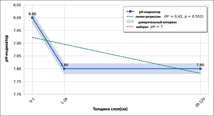 В разрезе 2 pH варьирует от 6,9 до 7,3. Наибольшее значение pH (7,3) было зафиксировано как в верхнем, так и в нижнем слоях. Наименьший показатель pH был обнаружен в слое глубиной 0,7–19 см, где pH составил 6,9 (рис. 3).