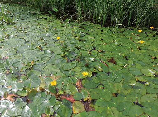 Проективное покрытие плавающих листьев в данном водоеме было почти 50 %, местами доходило до 80 % от площади водоема. В 2017 г. занимаемая популяцией площадь уже составляла около 40 м2, проективное покрытие листьев местами доходило до 100 % с явным большим перекрытием листовых пластинок. При продвижении популяции по течению реки ее площадь увеличивалась, при этом освоение видом водной поверхности осуществлялось за счет повышения плотности листьев растений [13].