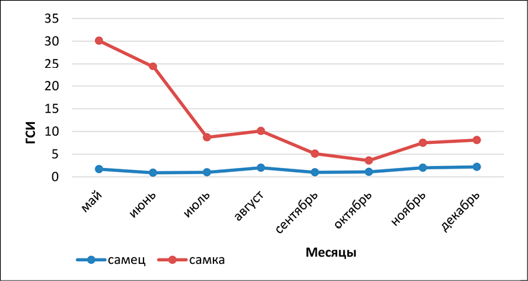 Анализ гонадо-соматического индекса показал, что периоды созревания яйцеклеток и сперматозоидов у самок и самцов совпадают. У особей обоих полов значения индекса начинают расти в ноябре-декабре, достигая максимума в мае (рис. 1).