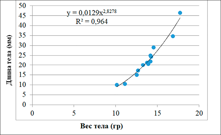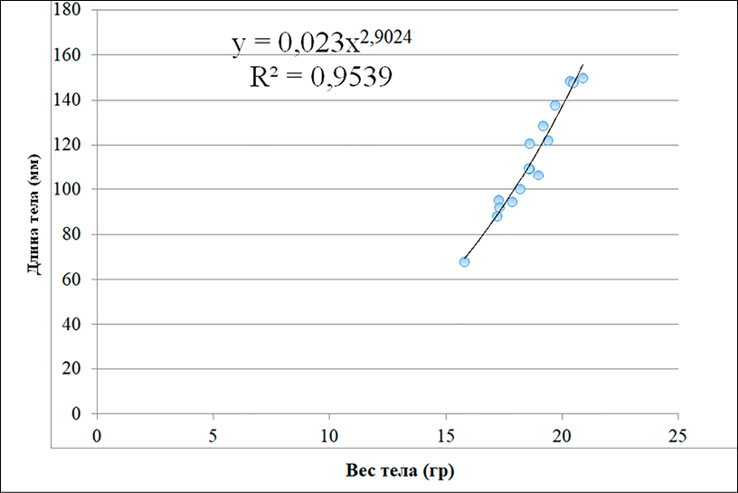 где W – общая масса (г), L – общая длина тела (см), a – коэффициент пересечения; b – коэффициент регрессии. Коэффициенты a и b вычислены следующим линейным регрессионным логарифмом: log(W) = log(a)+b*log(L) [9, c. 140]. Все статистические вычисления произведены программой MS Excel 2019.