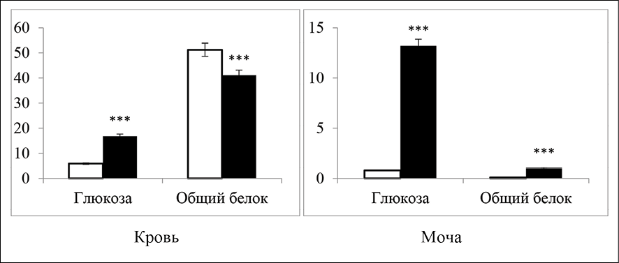 Рис. 1. Влияние аллоксанового диабета на содержание глюкозы и общего белка в крови и моче крыс (M±m, при n = 6); *** – P < 0,001