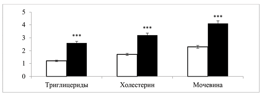 Рис. 2. Влияние аллоксанового диабета на содержание триглицеридов, холестерина и мочевины в сыворотке крови (M±m, при n = 6); *** – P < 0,001