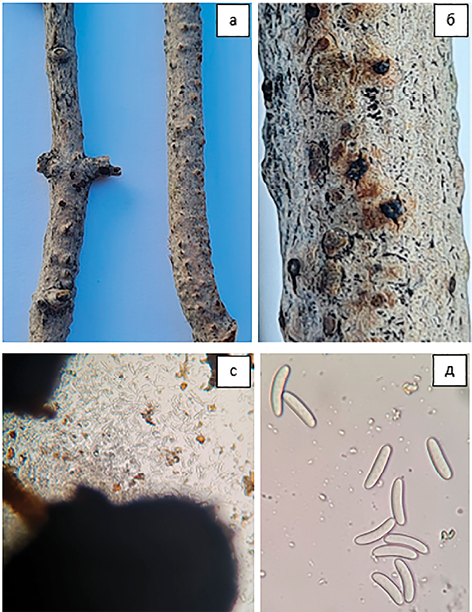 Рис. 2. Cytospora acericola: а – общий вид пораженных ветвей, б – конидиоматы, с – споры, выходящие из конидиомата, д – конидии