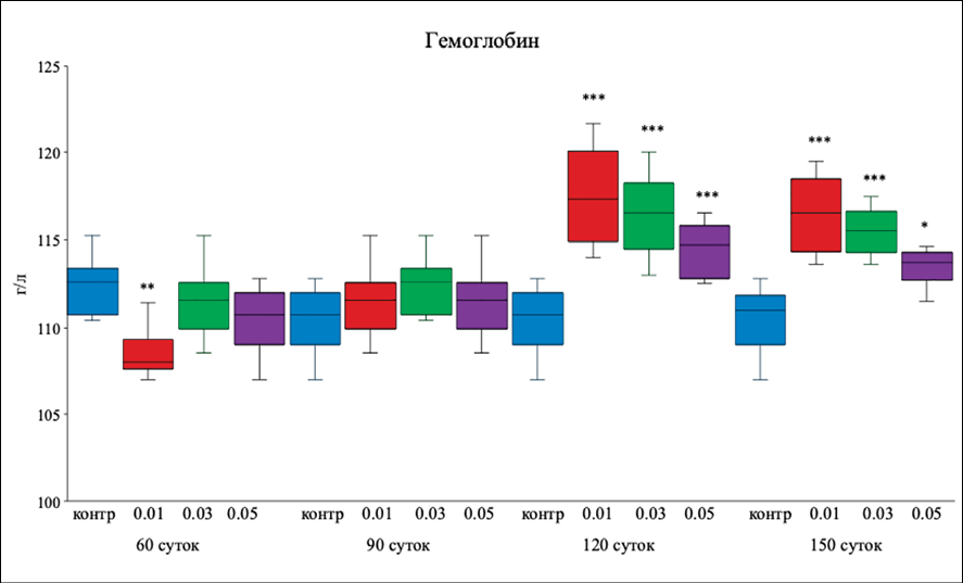 Без применения пробиотика в контрольной группе количественные показатели концентрации гемоглобина не изменялись у кроликов в возрасте 90, 120 и 150 суток. Изменение в процентах было недостоверным и незначительным – от 1,8 до 1,9 %. Добавление в рацион корма пробиотика «Олин» в дозе 0,01 г на 1 кг веса животного достоверно увеличило гемоглобин в возрасте 120 и 150 суток по сравнению с контролем (P < 0,001, апостериорный тест Бонферрони). Показатели увеличились через 120 суток на 6,4 % и через 150 суток на 6,3 %. В эксперименте, где доза пробиотиков была 0,03 г на 1 кг, показатели гемоглобина также достоверно увеличились у кроликов в возрасте 120 суток. Оба эти показатели увеличились на 2,3; 6,8 и 5 % соответственно возрасту. При добавлении дозы пробиотика в корм 0,05 г на 1 кг веса наблюдалось достоверное повышение гемоглобина (P < 0,001, апостериорный тест Бонферрони). Показатель гемоглобина стал выше на 1; 3,7 и 2,8 % в соответствующие возрасту сроки.