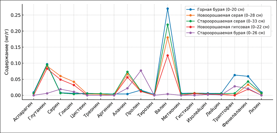 Тирозин был обнаружен только в горных бурых почвах на уровне 0,003 мг/г, тогда как в остальных исследованных почвах тирозин не выявлен, то есть отсутствует. Среди этих аминокислот валин четко выделяется по количественным показателям, в основном колеблясь в диапазоне 0,124–0,270 мг/г. Как и ожидалось, наибольшее его количество зафиксировано в горных бурых почвах, а наименьшее – в новоорошаемых серо-бурых почвах. Метионин, гистидин, изолейцин и лейцин распределяются в исследованных почвах в сходных пропорциях, но их минимальные значения отмечены в горных бурых почвах.