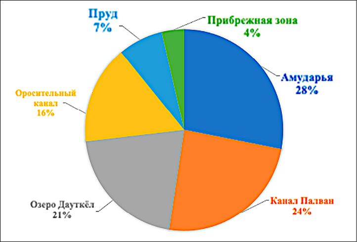 1. Температура воды колебалась от 16 до 30 °C в зависимости от сезона и типа водоёма. Наибольшие значения отмечались в оросительных каналах и водохранилищах летом, а минимальные – в мелких стоячих водоёмах.