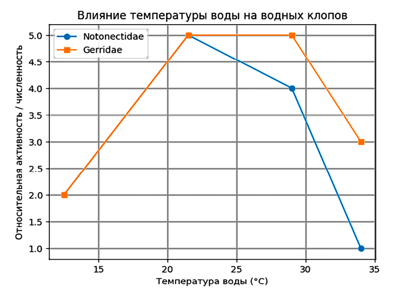 При низких температурах воды (10–15 °C) отмечается общее снижение физиологической и трофической активности водных полужесткокрылых. Так, представители семейства Notonectidae становятся малоподвижными и значительно реже проявляют охотничье поведение. Аналогичная тенденция наблюдается у Gerridae, численность которых в холодных водоёмах существенно ограниченна (рис. 2).